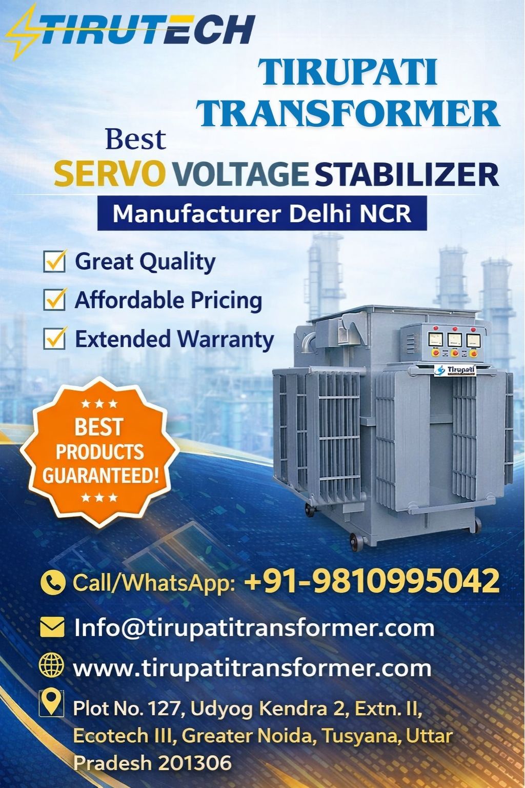 If you are looking for a servo stabilizer supplier in Delhi NCR, industrial voltage stabilizer manufacturer in India, or power solutions company that can be trusted, then Tirupati Transformer is your best bet. We provide the best prices, the quickest delivery times, and the best after, sales support.