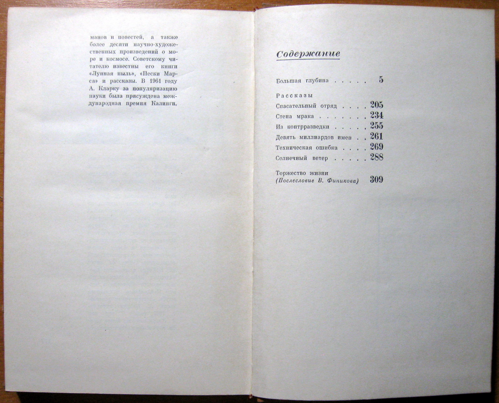 Содержание: Большая глубина; Спасательный отряд; Стена мрака; Из контрразведки; Девять миллиардов имен; Техническая ошибка; Солнечный ветер; Торжество жизни.
