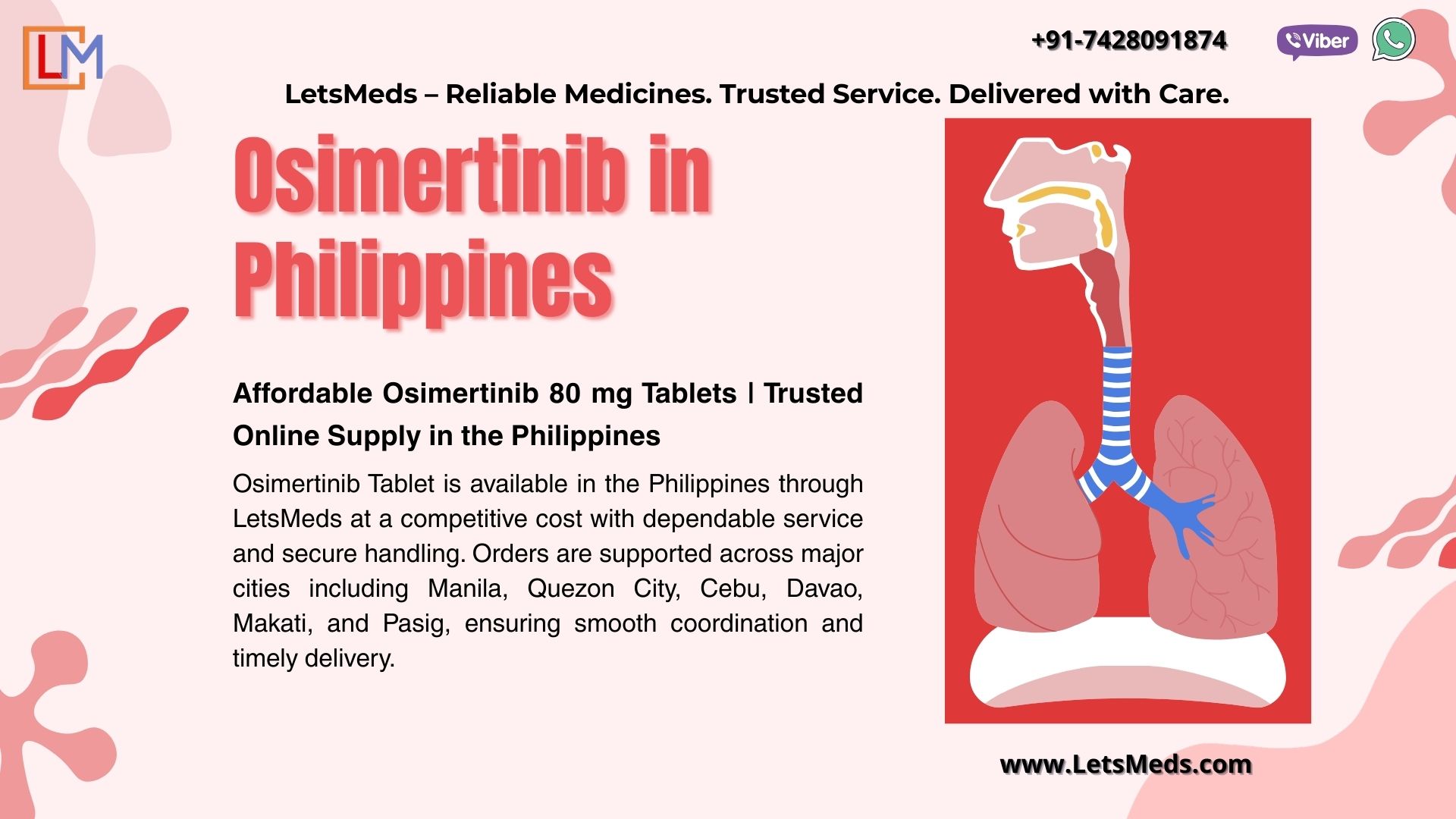 Osimertinib Tablet is available in the Philippines through LetsMeds at a competitive cost with dependable service and secure handling. Orders are supported across major cities including Manila, Quezon City, Cebu, Davao, Makati, and Pasig, ensuring smooth coordination and timely delivery. LetsMeds focuses on reliable supply, clear communication, and safe packaging for a hassle-free ordering experience. For pricing and order support, contact WhatsApp +91-7428091874.