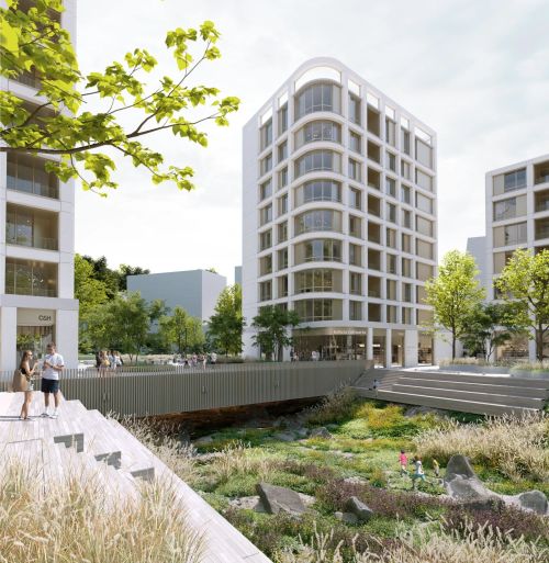 Зона включає дитячі майданчики з м’яким покриттям, тіньові навіси для кожної групи з ігровими зонами, призначені для фізичного розвитку та гри дітей, які об’єднані озелененням і інтегровані в загальну концепцію благоустрою.