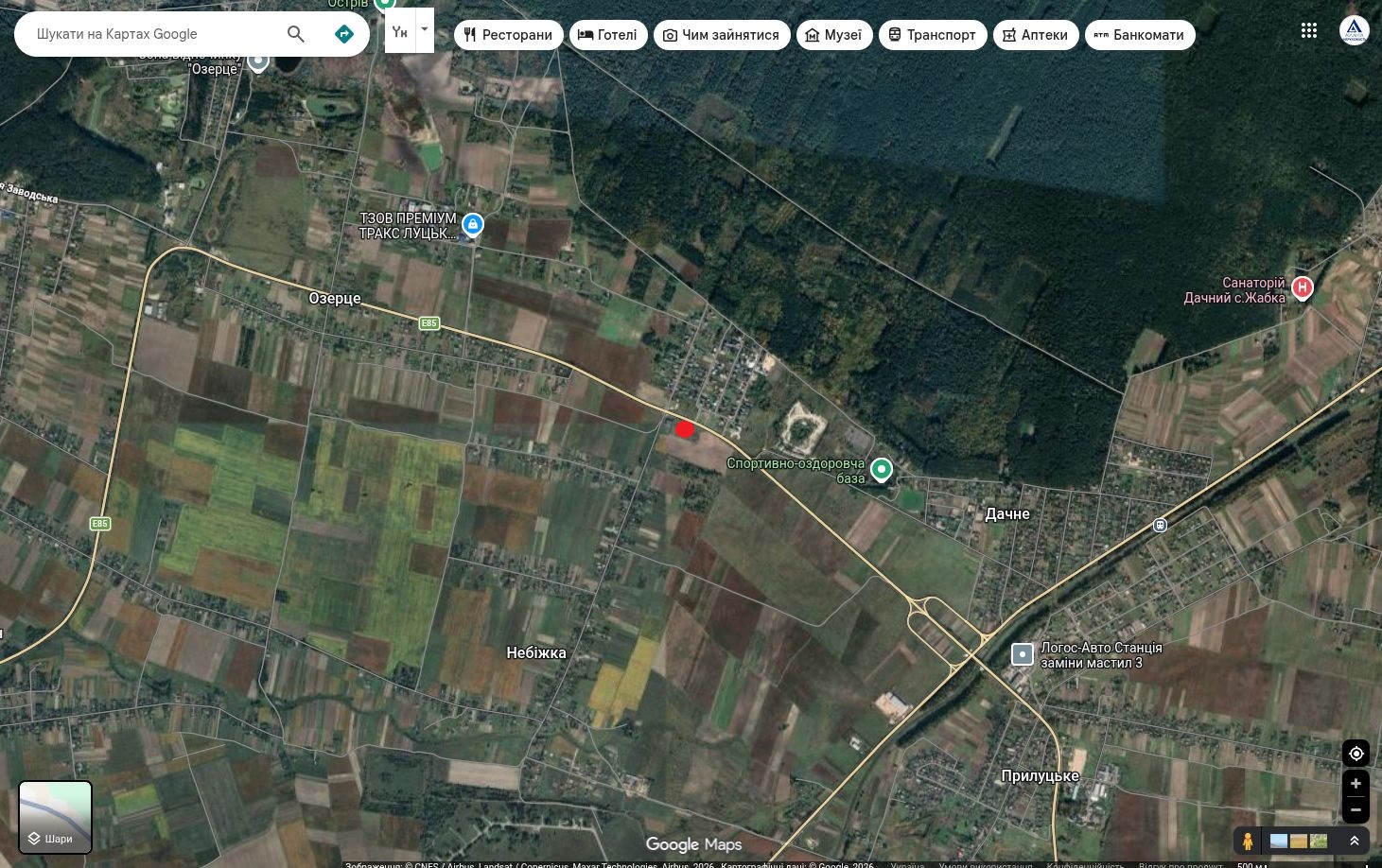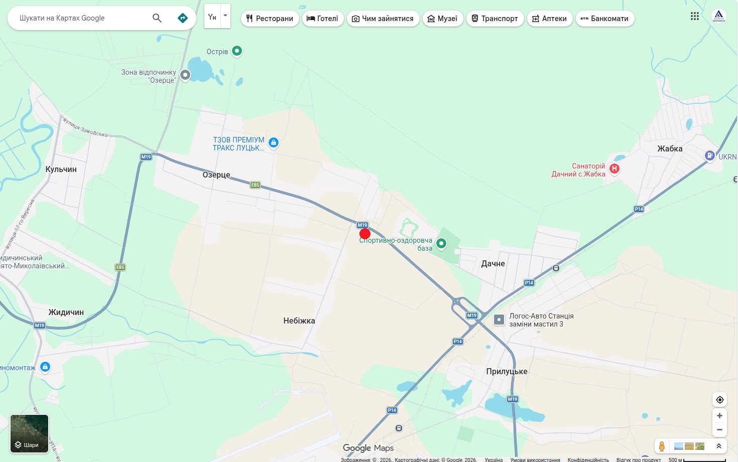 с. Небіжка (перед вїздом в с.Озерце). Фасад Об'їзної - 52,5 м., 1,5 км. до Ківерцівського мосту, 9 км. до кільця Промінь/Яровиця.