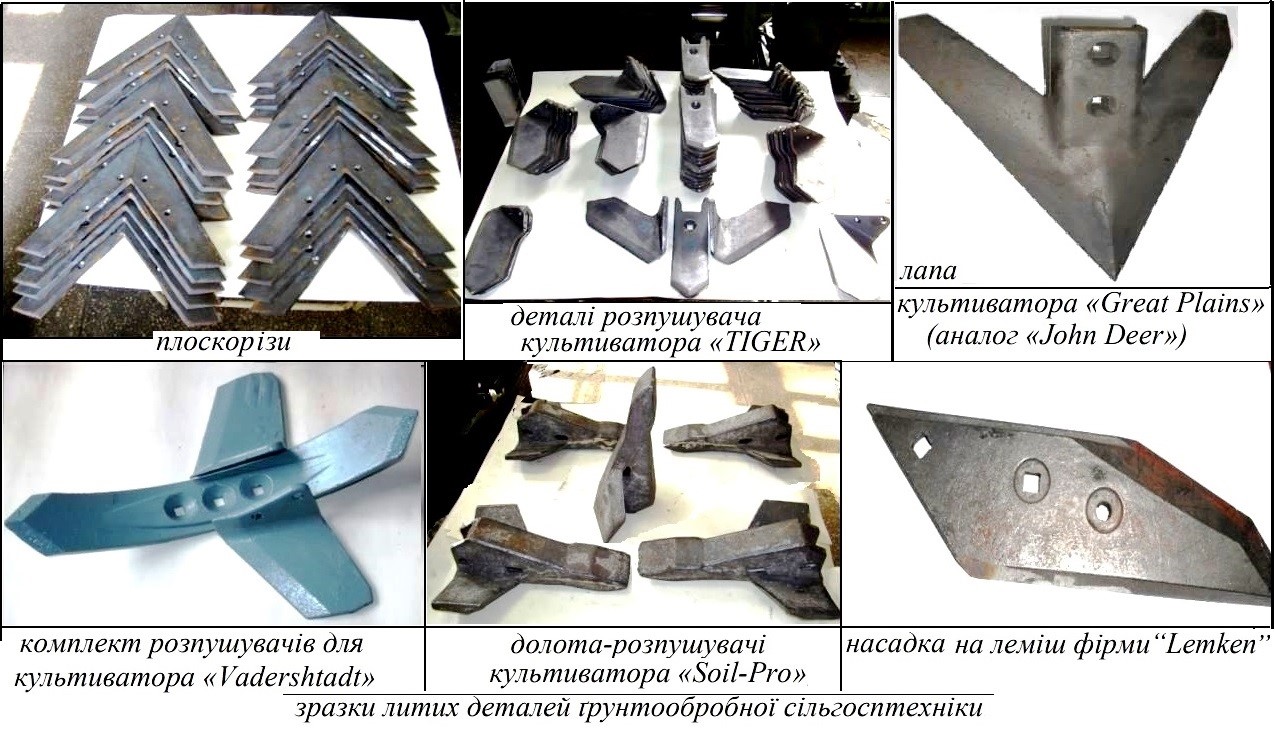 Металовироби для сільгосптехніки, лемехи плугів, культиваторів, плоскорізи, зуби борони, плоскорізи, деталі млинів і крупорушок, навісні деталі для тракторів, ливарні заготовки і виливки з металу, металоконструкції, запчастини металеві для конвеєрів і елеваторів.