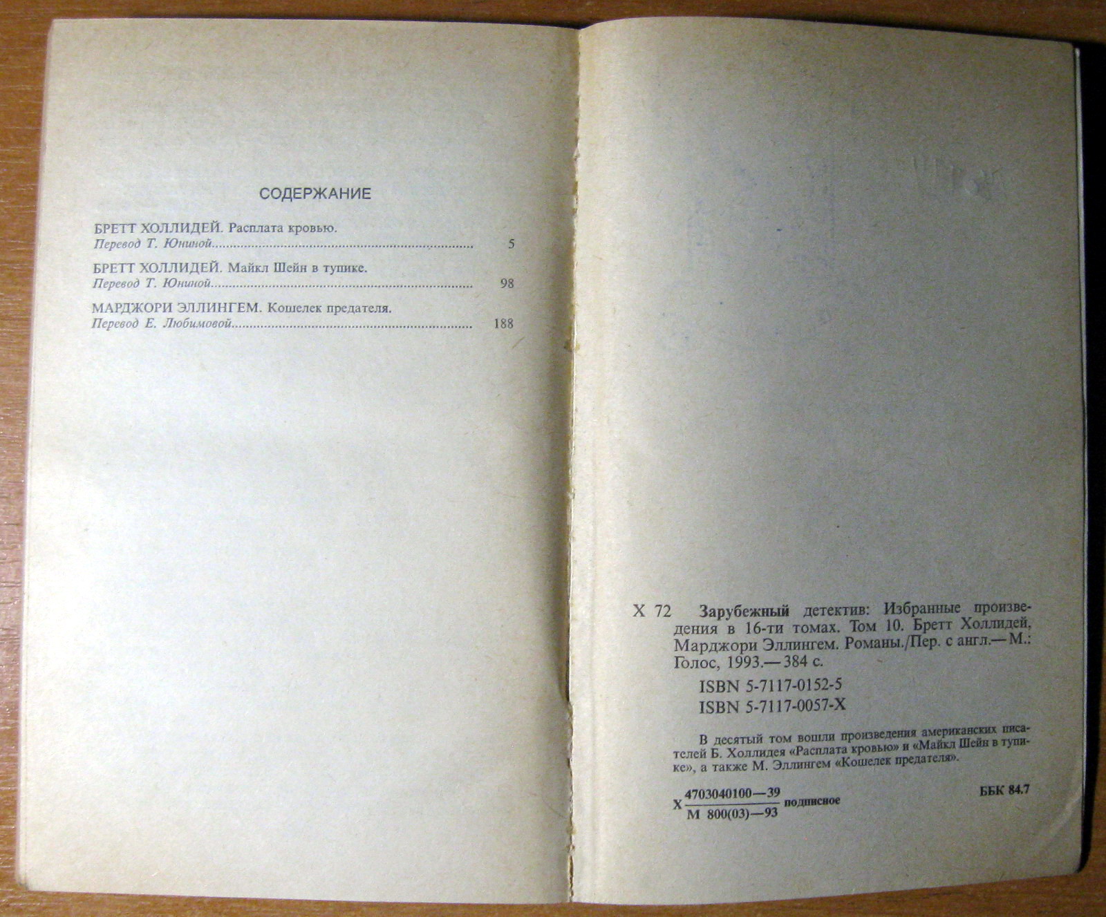 В десятый том вошли произведения американских писателей Б.Холлидея «Расплата кровью» и «Майкл Шейн в тупике», а также М.Эллингем «Кошелек предателя».